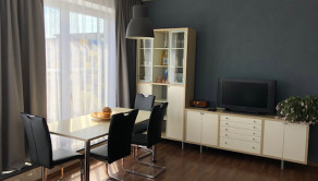 Byt sa nachádza na 5-6 poschodí tehlového domu skolaudovaného v roku 2005. Úžitková plocha bytu - 77m2 /viď pôdorys/. Výhodou bytu je veľká svetlá obývačka s výhľadom na stromy parku prepojená s kuchyňou. Vedľa druhej izby sa nachádza veľký 14m2 šatník. Byt je možné kúpiť aj komplet zariadený. V byte sa nachádza bežný štandard - umývačka riadu, mikrovlnka, rúra, plynový varič, práčka, zariadená kuchyňa riadom, kablová TV, WiFi internet a dve klimatizačne jednotky. Byt je možné prerobiť na menší trojizbový /viď. návrh pôdorysu/. Je vhodný aj na účely kancelárie alebo ateliéru... Mesačné režijné náklady sú cca 160 eur. Parkovanie pred domom na ulici.